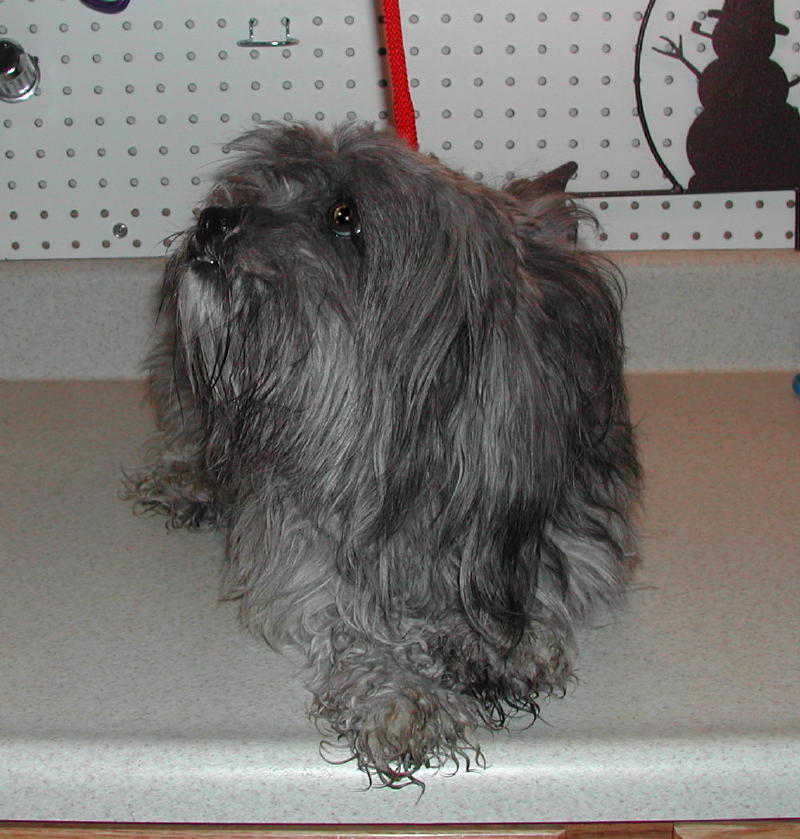 Not willing to make him wait another day in that condition, I started cutting the mats off him with a small pair of scissors. Four hours later and some nicks because the skin was so tightly adhered to the mat, we had a buck nekkid dog. A nice dog who didn’t once try to bite or nip at me despite having plenty of opportunity to do so. His color pattern was a bit of a surprise … he arrived charcoal gray and emerged a brindle after his grooming! One of the local radio stations was doing a tribute to “The King” that day and Elvis Poopsley just kinda fit, so Elvis it was.